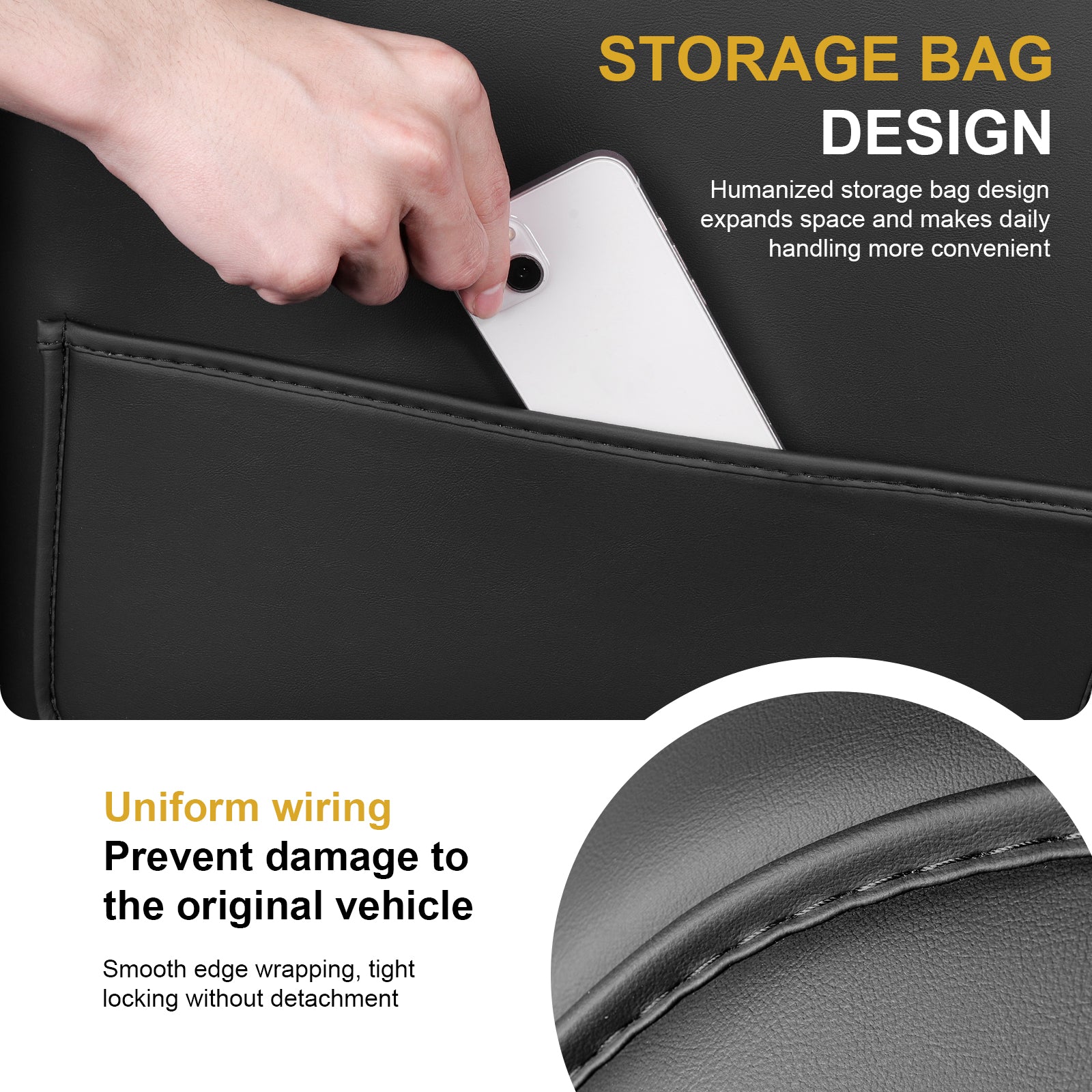 - Storage Organizer Pockets: Each model 3/Y seat back kick protector is equipped with one storage pocket. Beverages, cell phones, tissues, snacks or books can be stored well, enlarges organization space in your loved car.