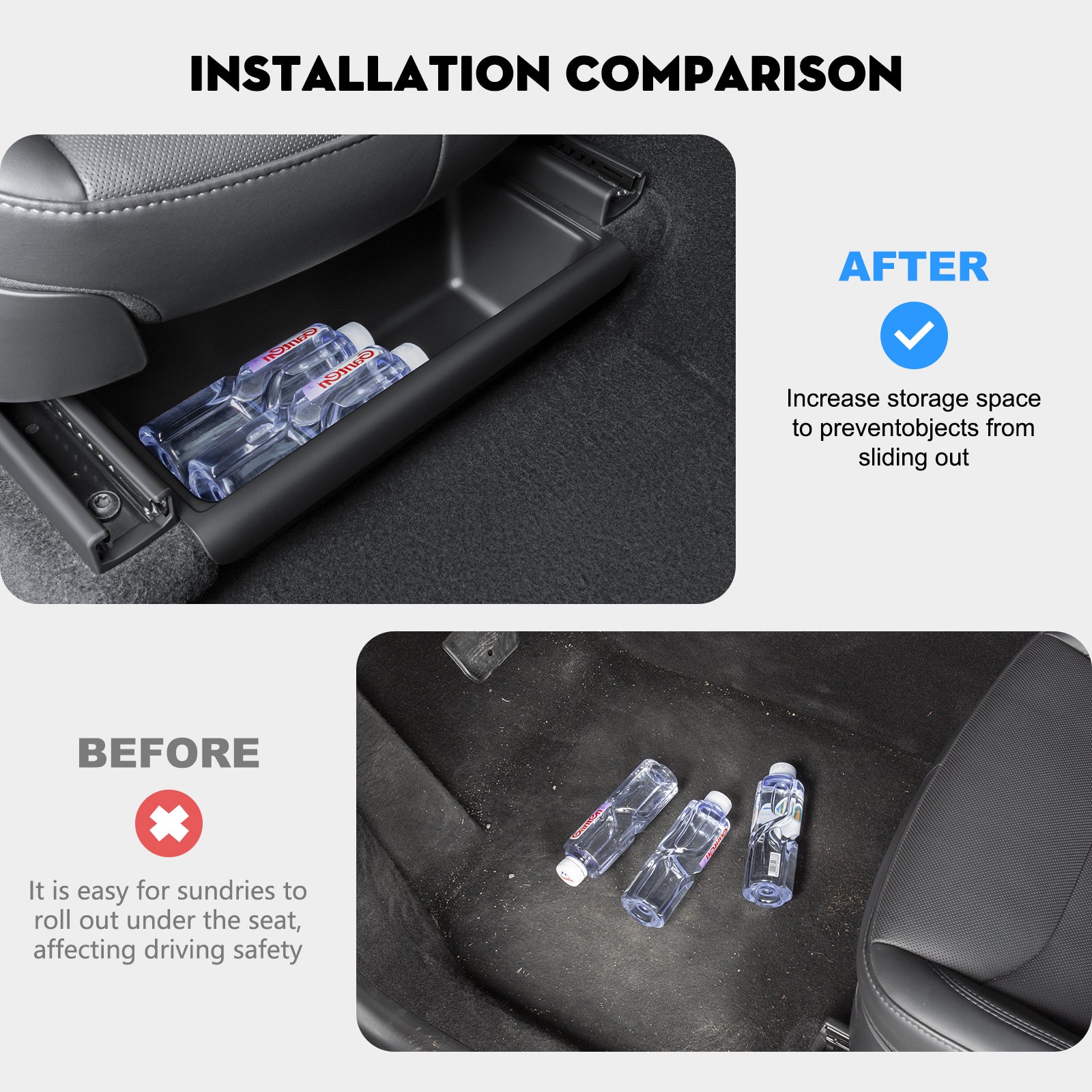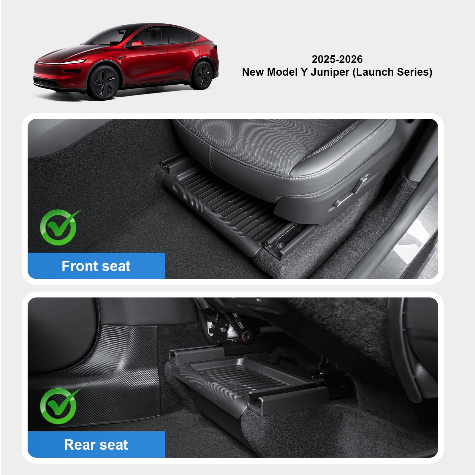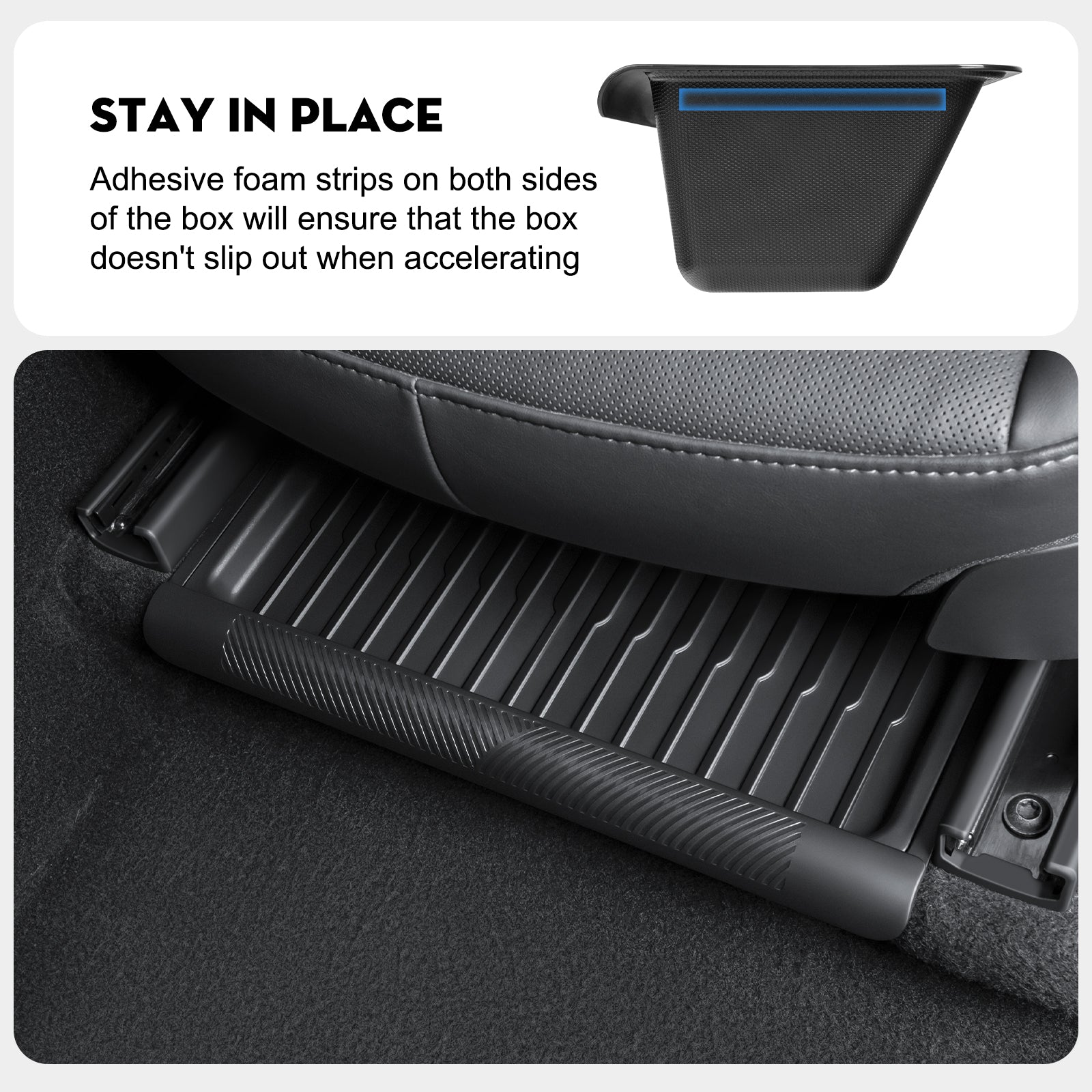 Perfect fit size: Our new TEP Under Seat Storage Box is 38*20*10cm in size,0.5KG in weight, light in weight, easy to install, can slide into 2025 Model Y Juniper perfectly and fit tightly, so it doesn't Will rock around and move into place.