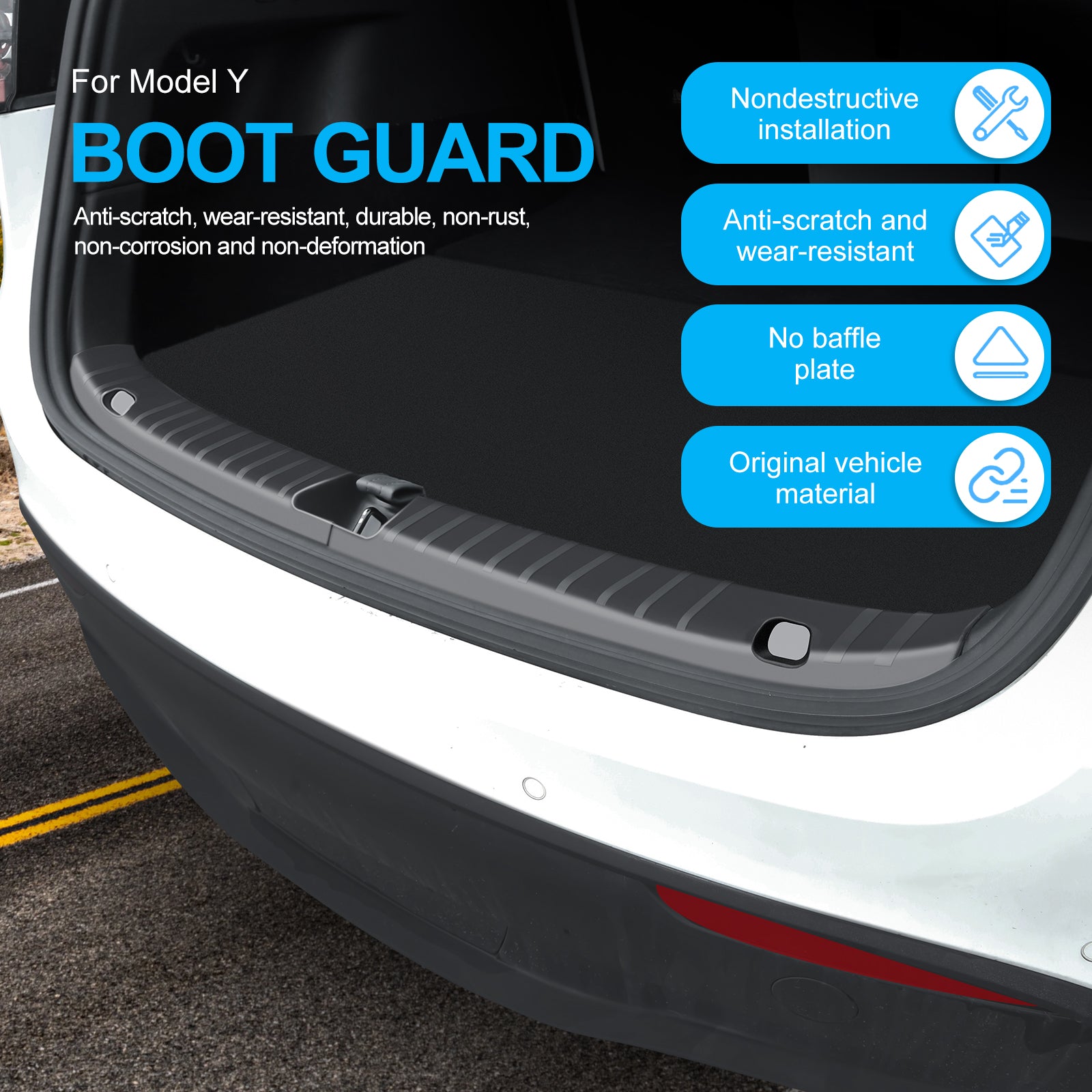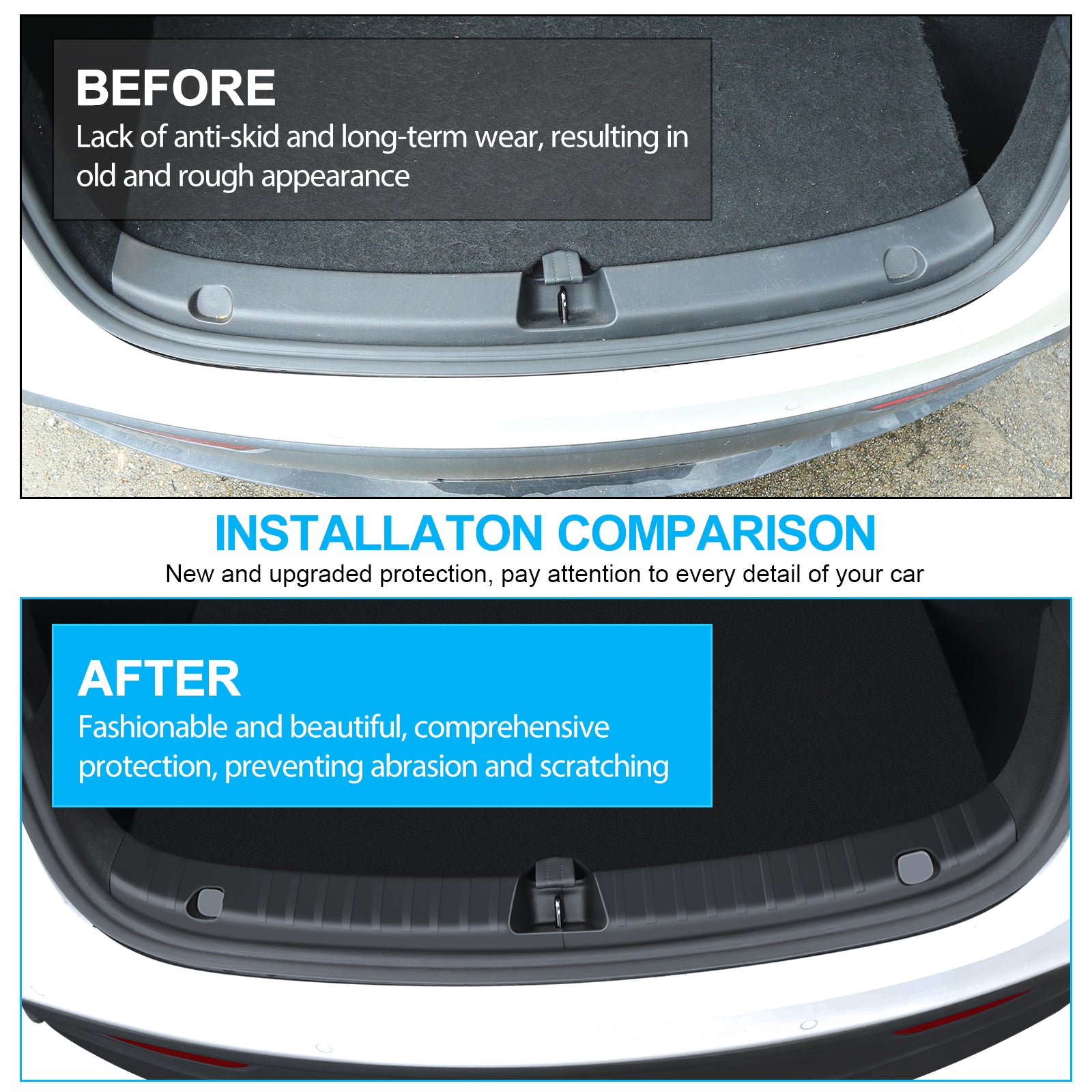- Non-slip surface design. The Tesla Model Y rear bumper guard can better protect the rear bumper of your car when you load and unload large items.