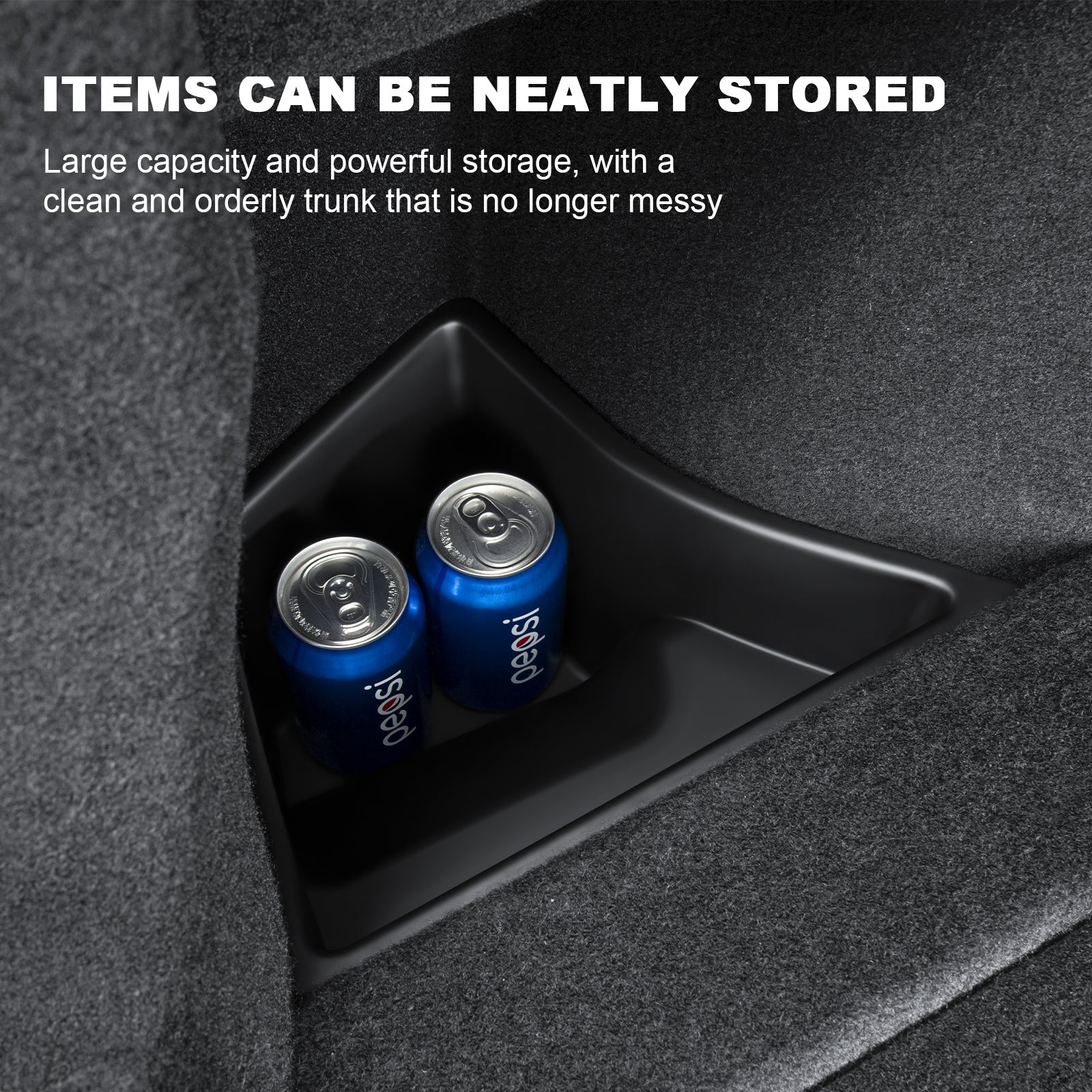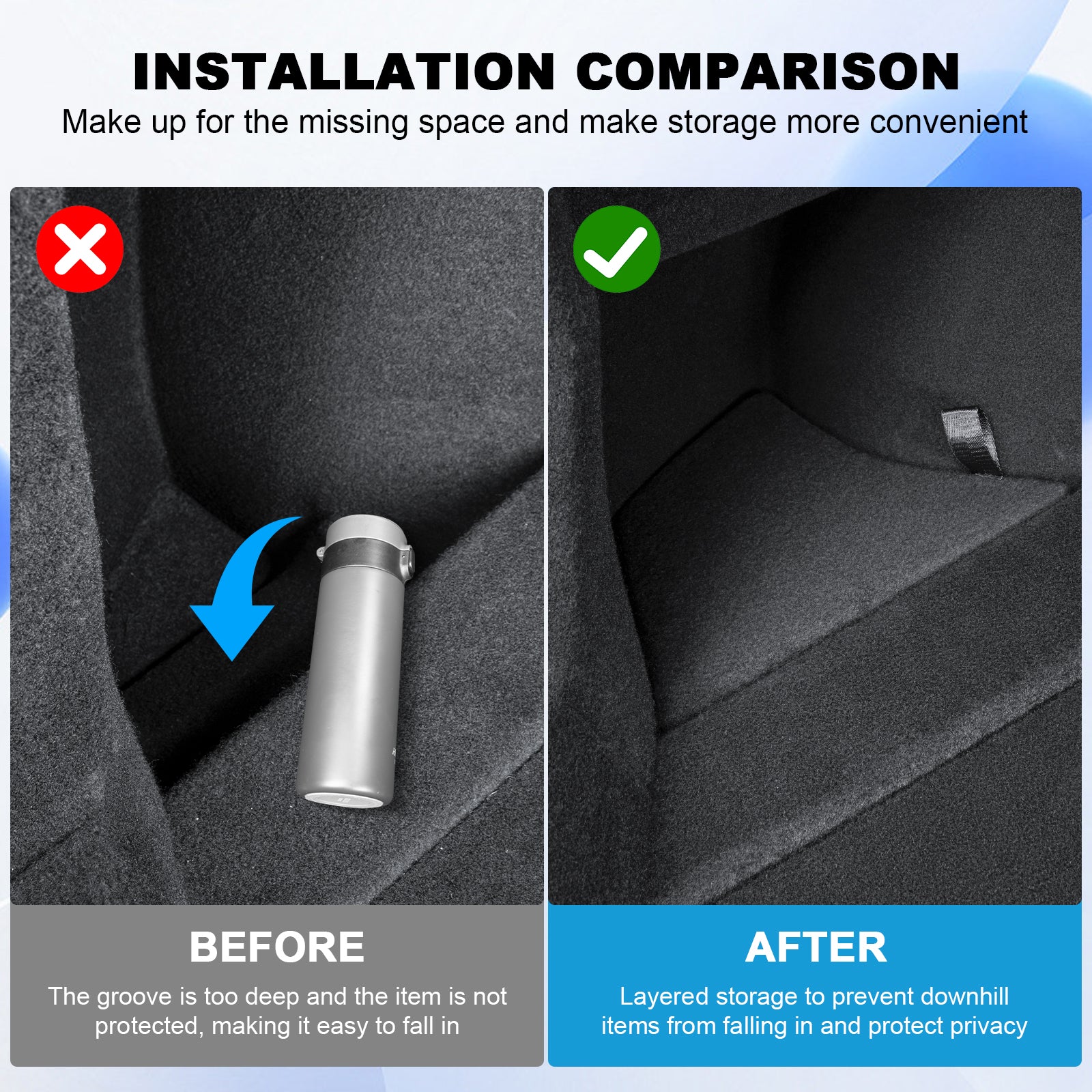 【Features】2024-2025 Model 3 trunk storage slides into slots in the left and right trunks, which allows you to store shoes, tools, gear and other items. And the carpeted lid blends seamlessly into the trunk, expanding floor space and cargo area.
