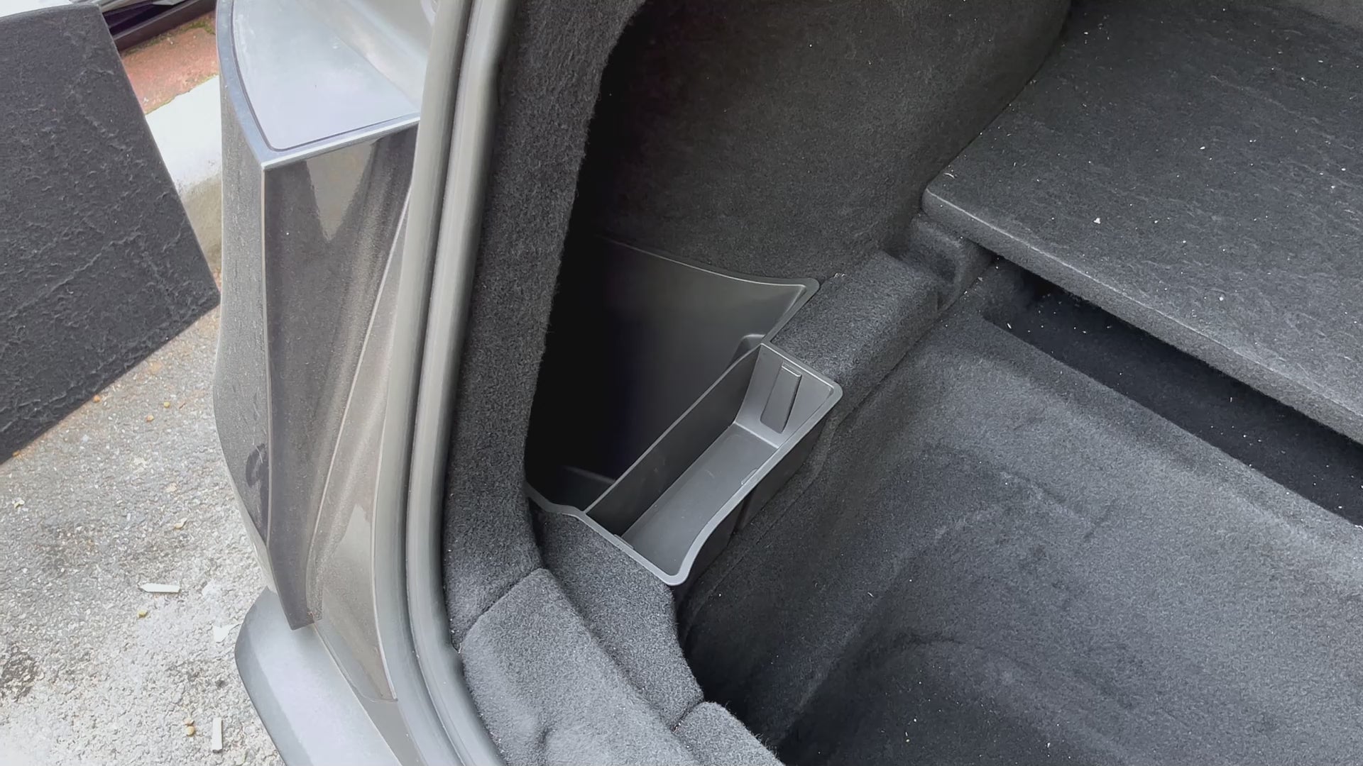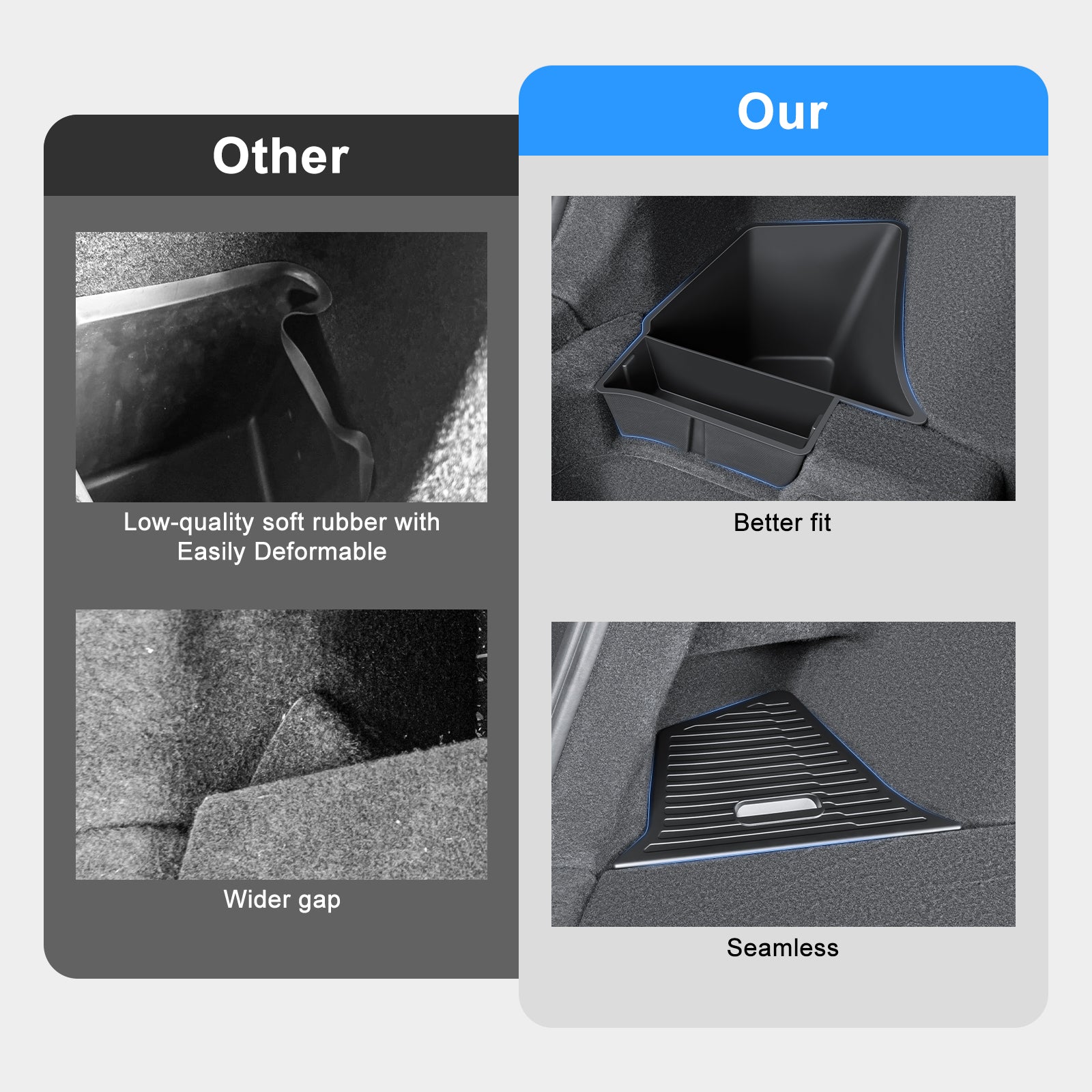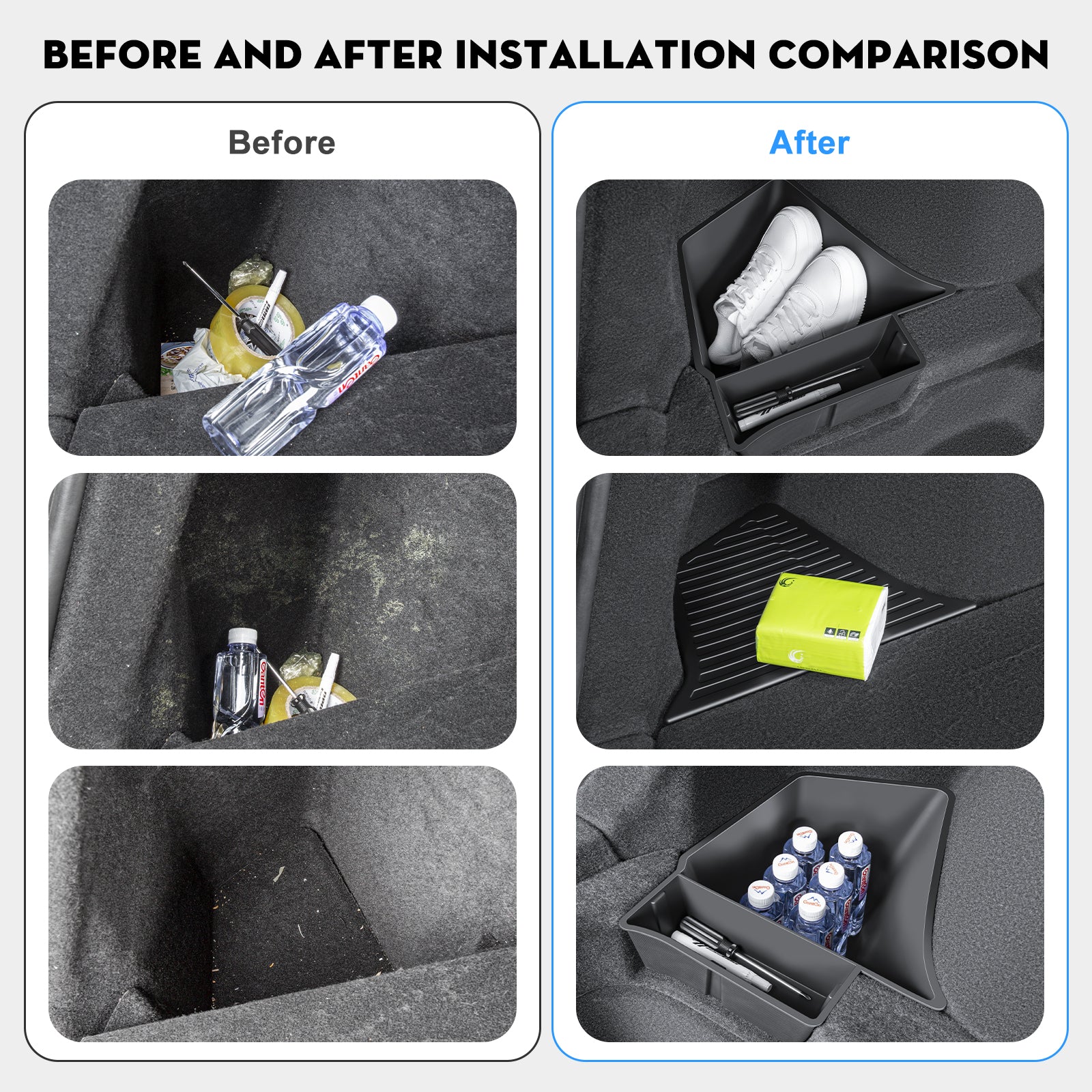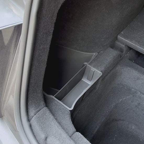 - 1:1 Customized Design: Model Y Juniper rear trunk bins perfectly fit Tesla Model Y Juniper 2025 2026 5 seater. Can't fit 7-seater Model Y Note: Before installing the storage box, remove the trunk cover plate/floor mat.After installation, replace the cover plate/floor mat, then install the box lid. When removing the storage box,the trunk cover plate/floor mat must also be removed.