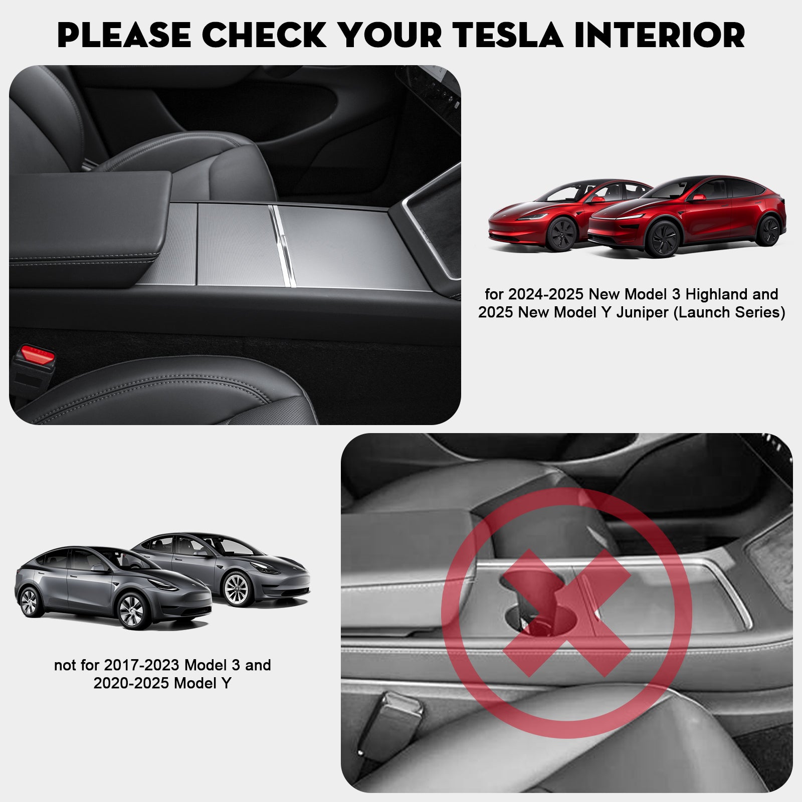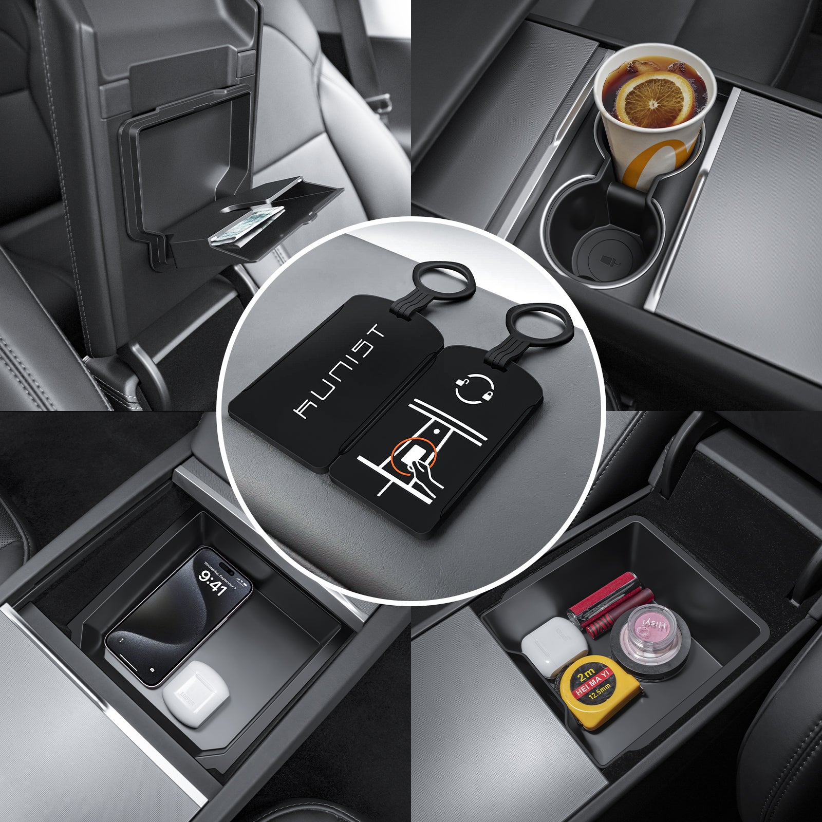 - 5 in 1 Comprehensive Package: Our product package includes 1 front center console trays,1 rear center console trays,1 armrest hidden storage box,1 key card holder and 1 cup holder. Perfect for 2025-2026 New Model Y Juniper and 2024-2025 Tesla Model 3 Highland.