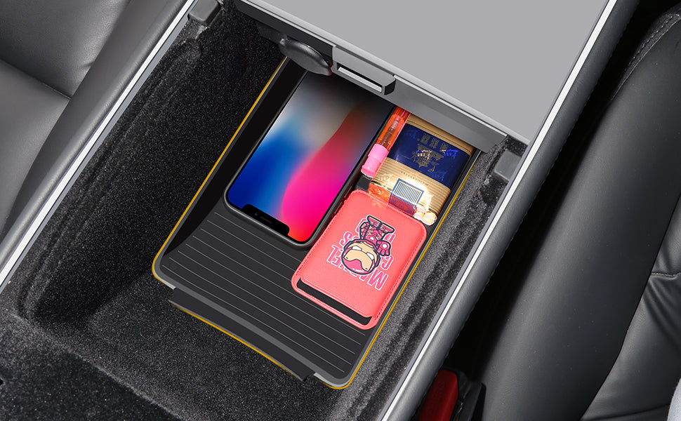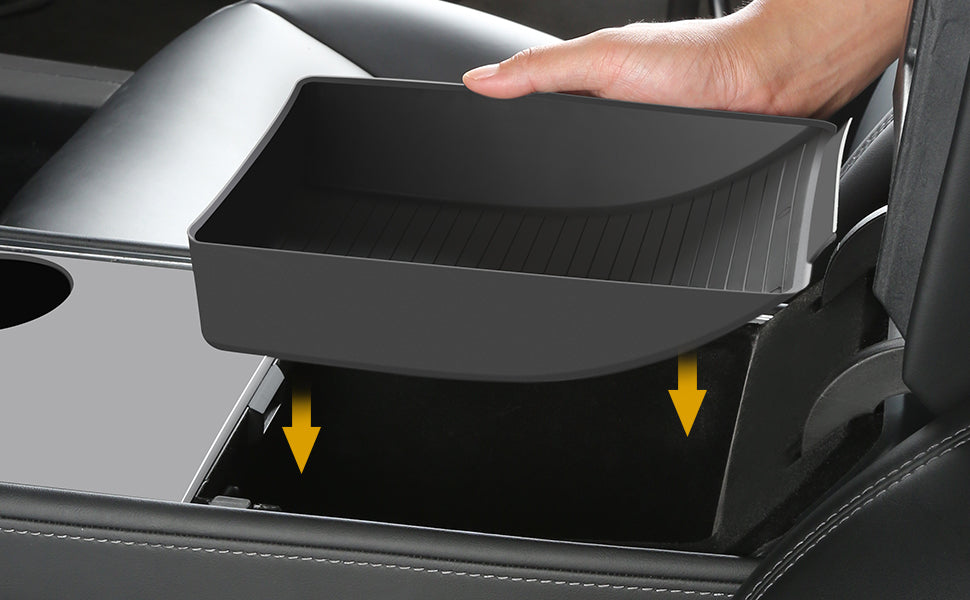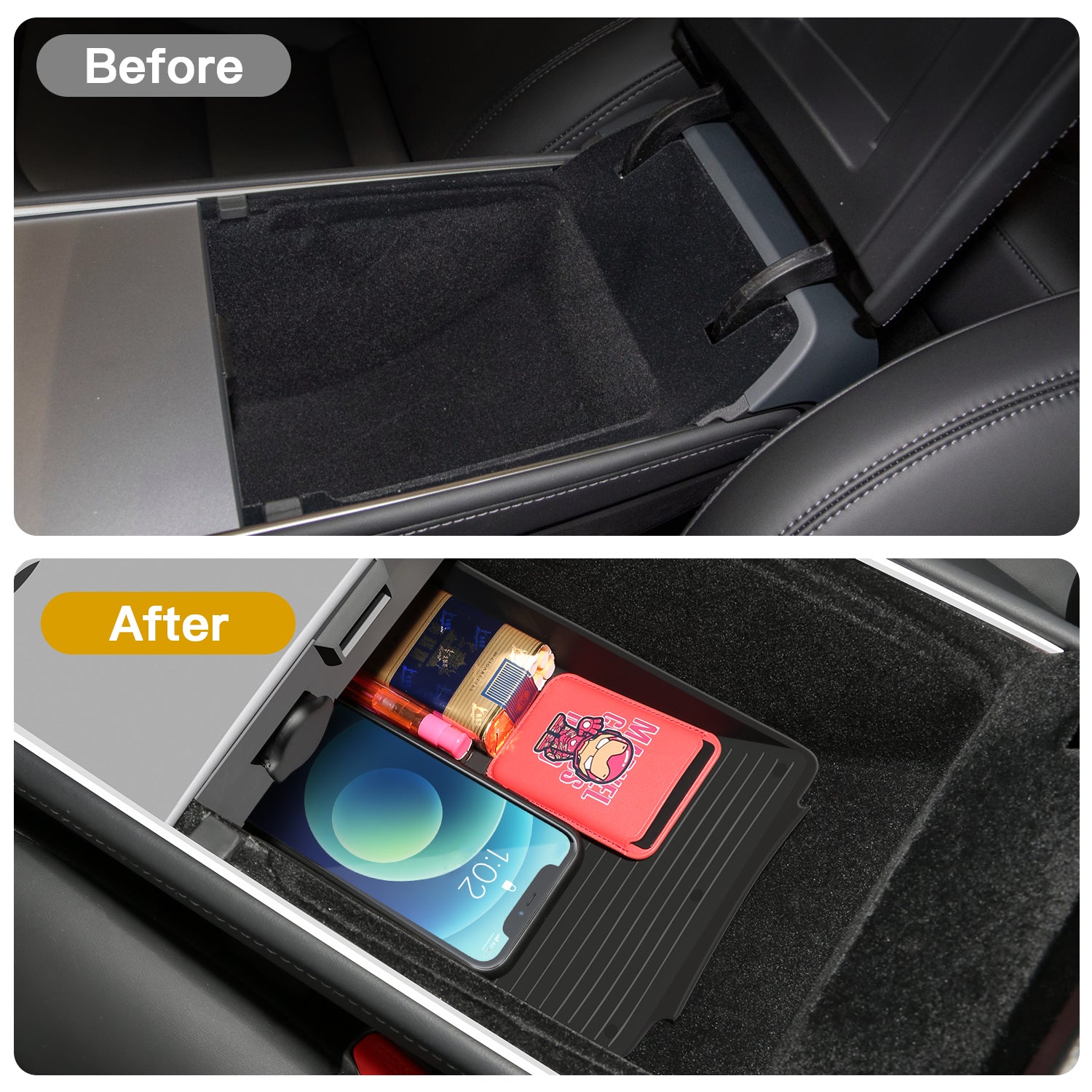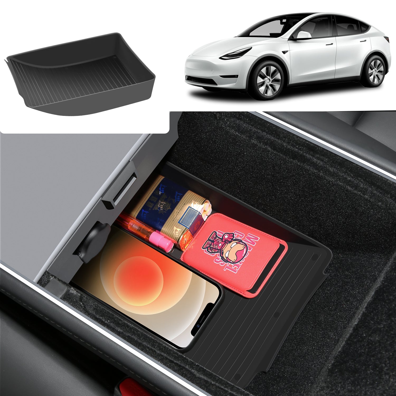 - Center Console Organizer for Model 3 and Model Y. It is hidden in the bottom of the armrest box and is easily accessible.