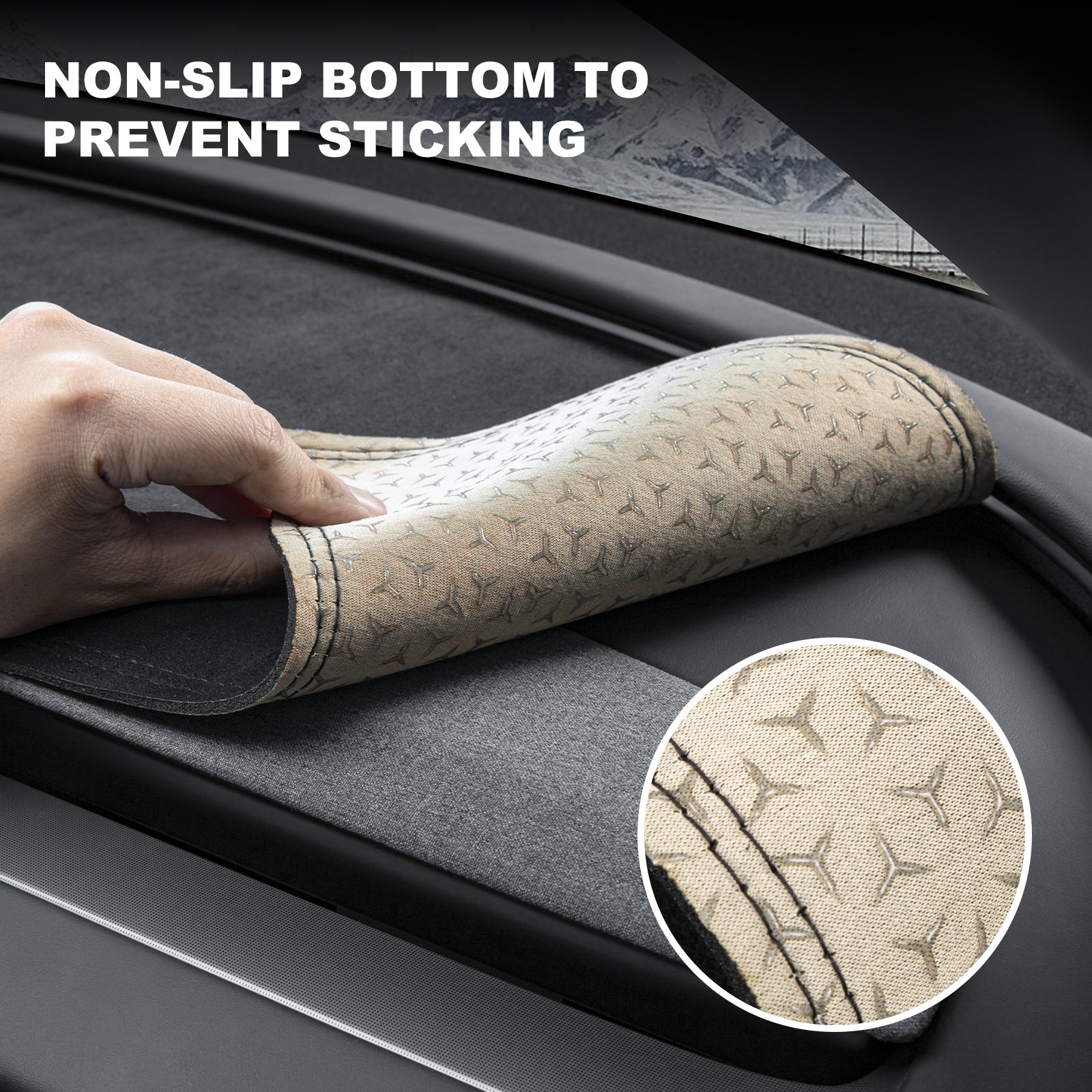 Simple Installation: With a dense anti-slip silicone particles at its back, great grip, so the dash cover mat will stay in place when suddenly accelerating, braking or going uphill. Just lay it on top or secure it with our adhesive pads.
