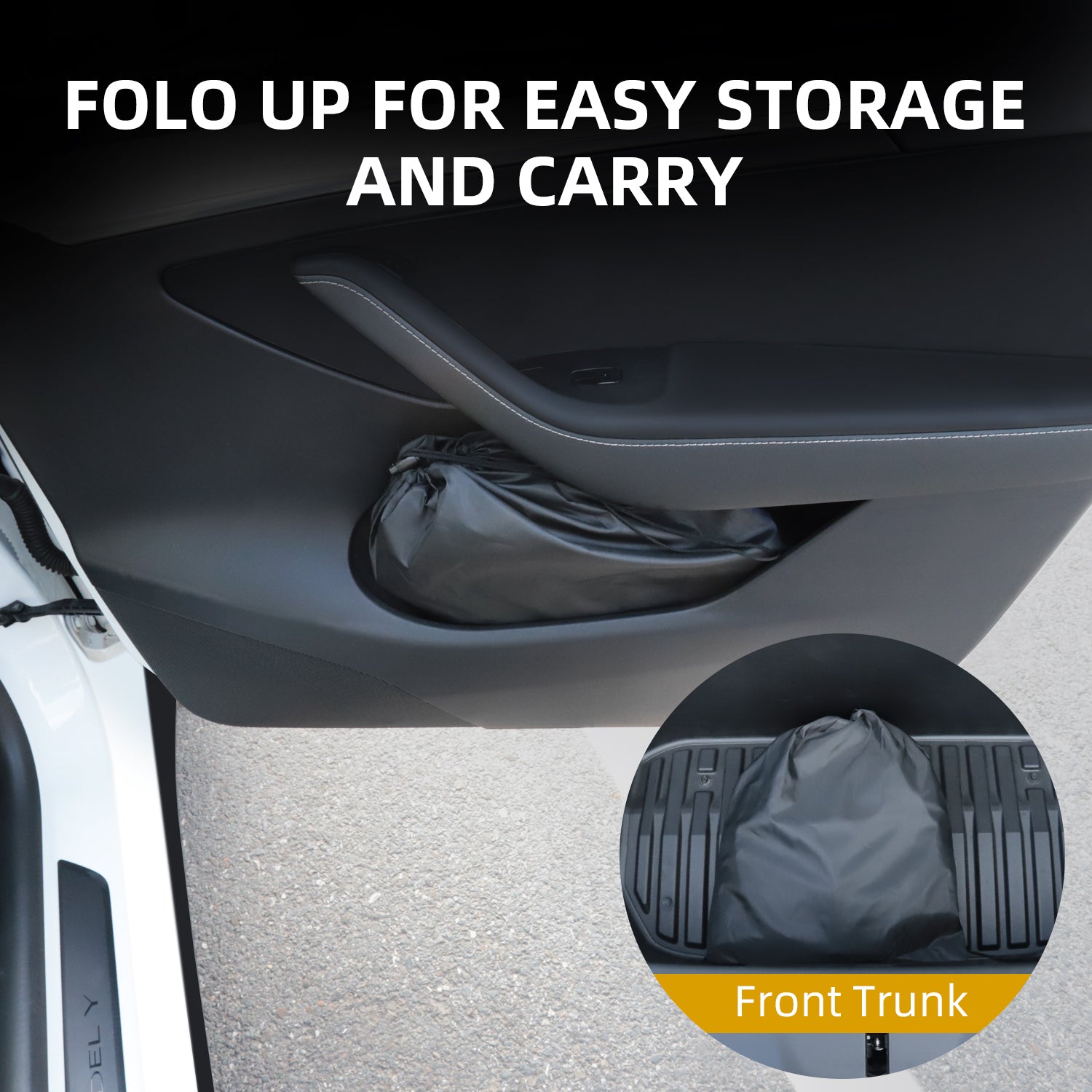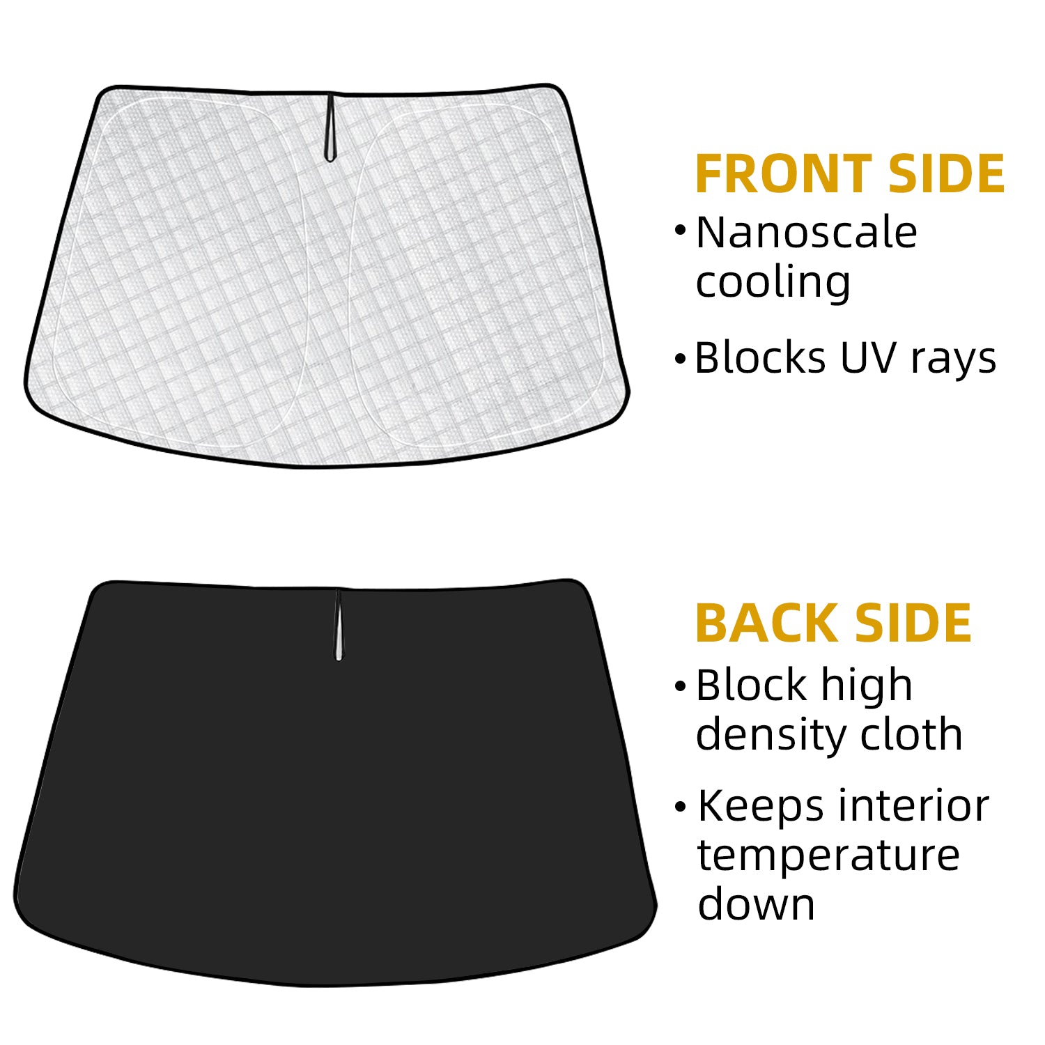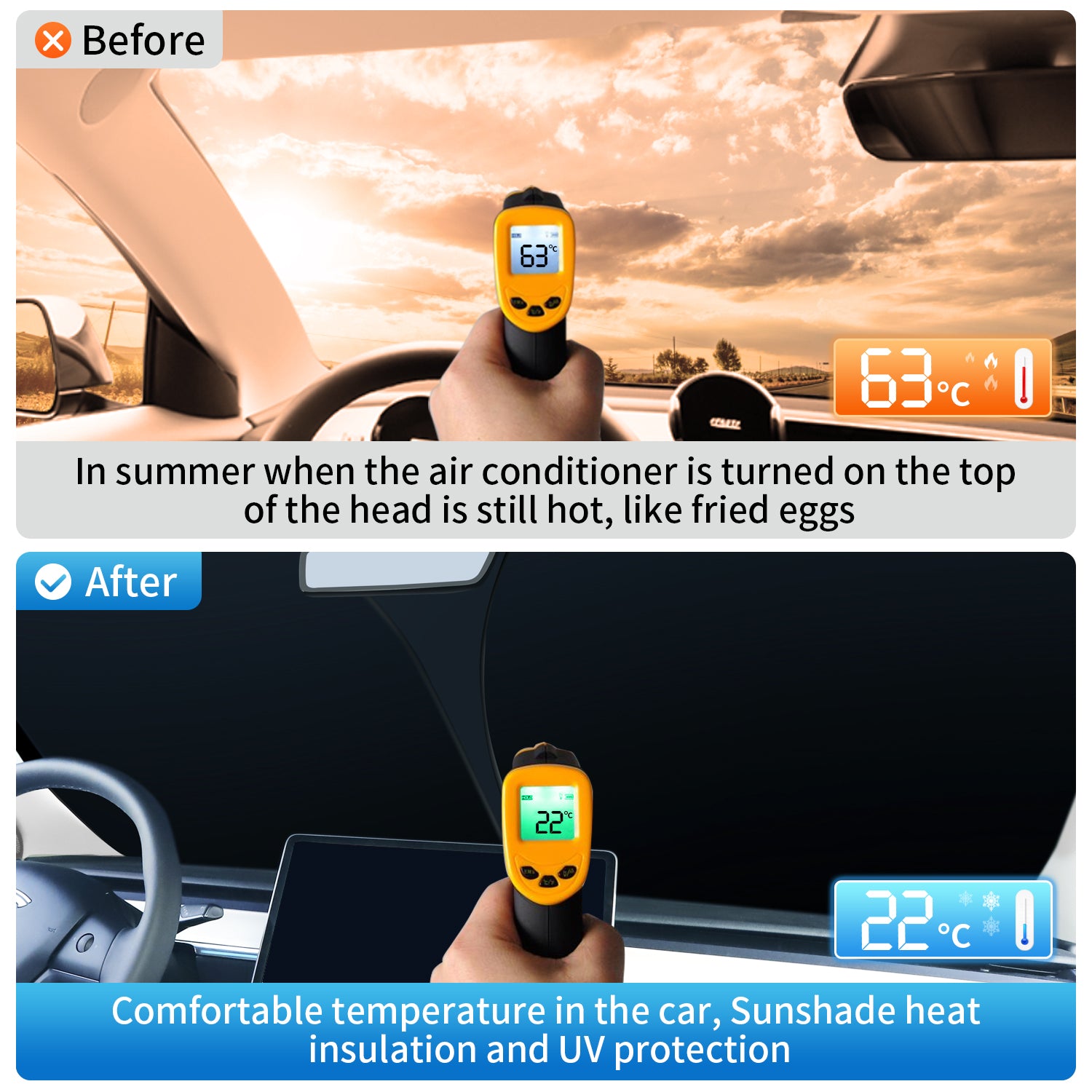- 【Custom Design】The windshield sunshade is custom-made specifically for the Tesla Model Y. The precise fit design and reinforced steel rings make it enough to fit the sunshade precisely to the window, without the need for suction cups to hold it in place. It won't sag or collapse. Compatible with Tesla Model Y.