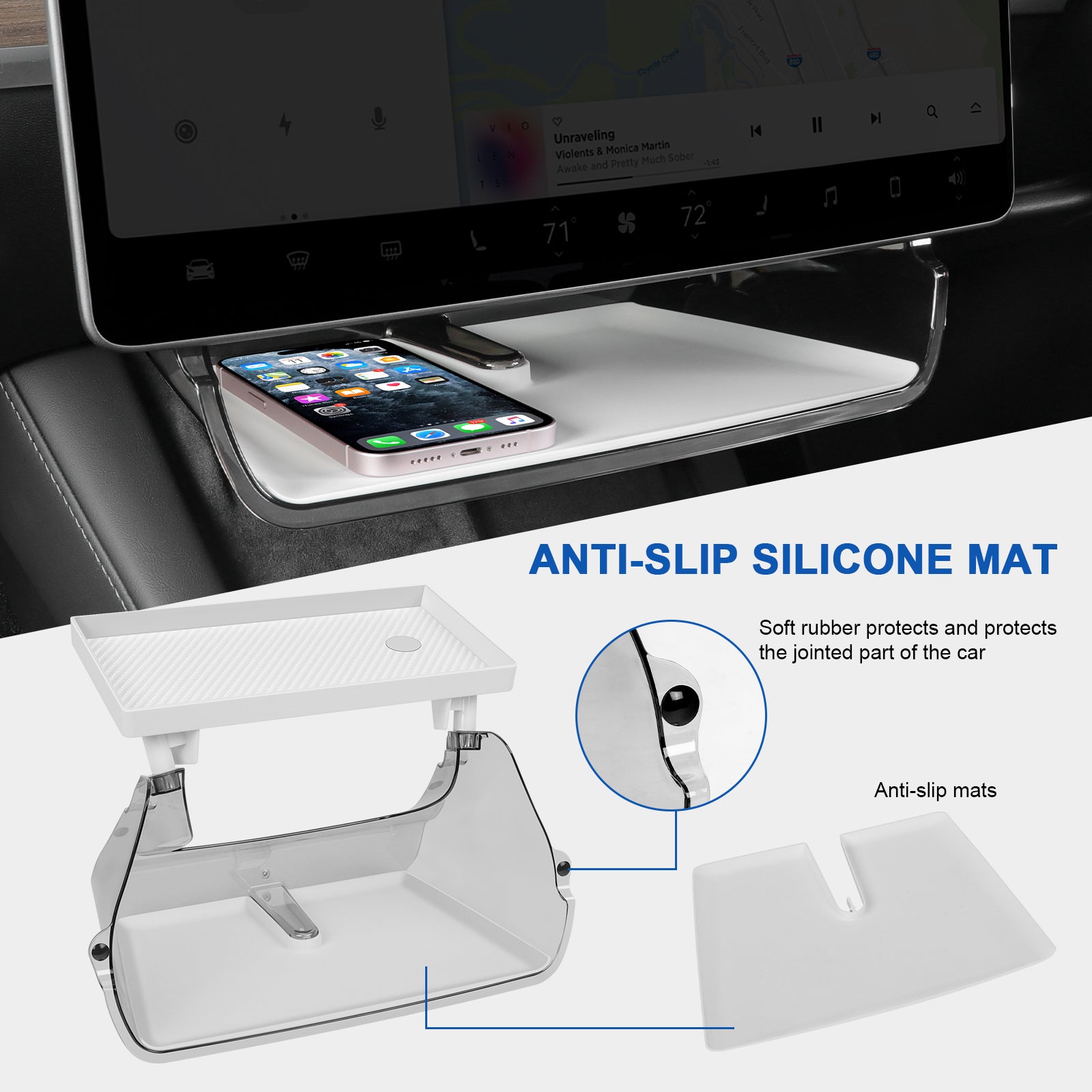 - The lining of the storage box under the Tesla screen is a silicone pad that is anti-slip and anti-vibration, keeping items in place and not making noise when you accelerate or brake.