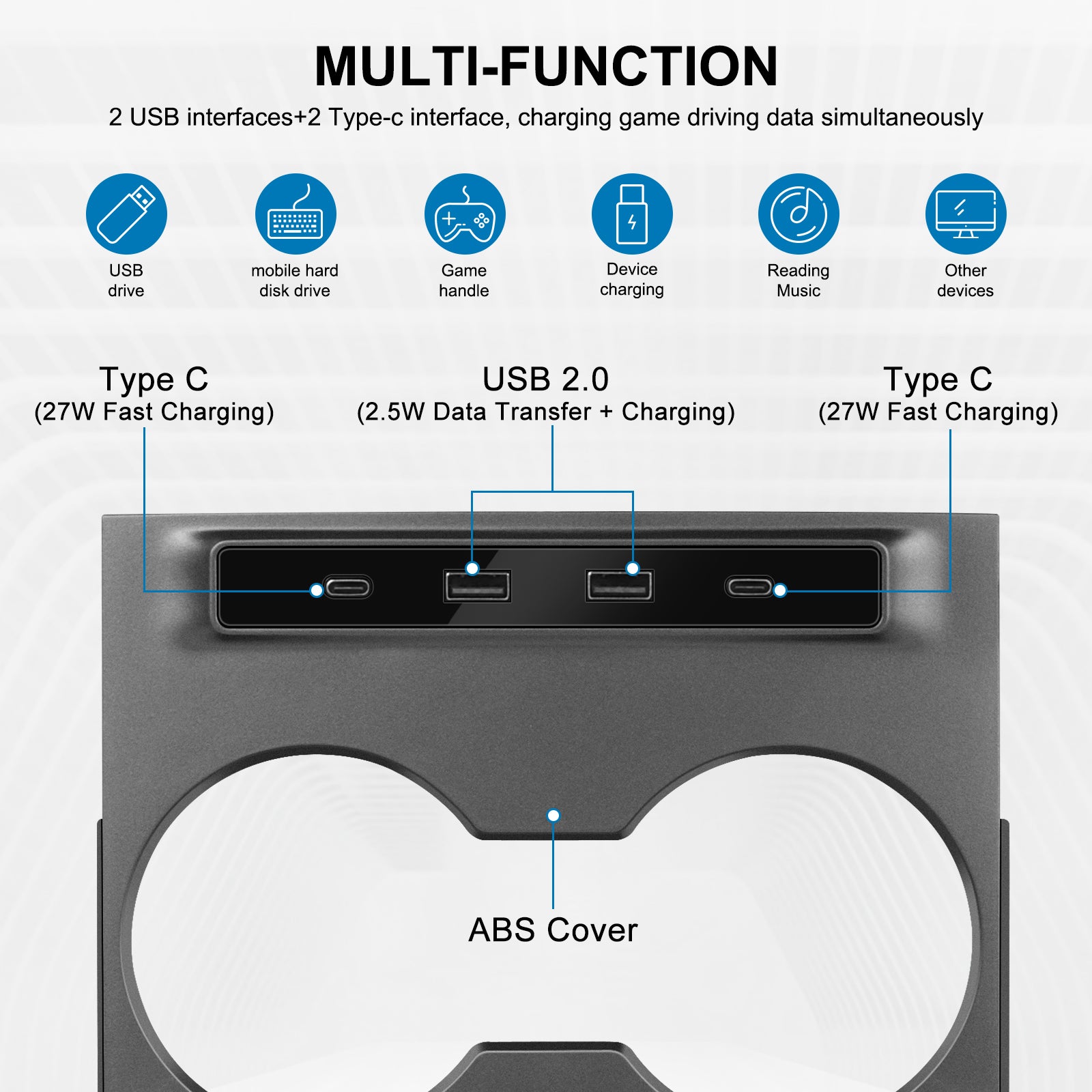 - This multi-port USB hub center console cover is made of high-quality ABS material, which can effectively avoid the wear and tear of the center console in daily use and provide a comfortable touch.