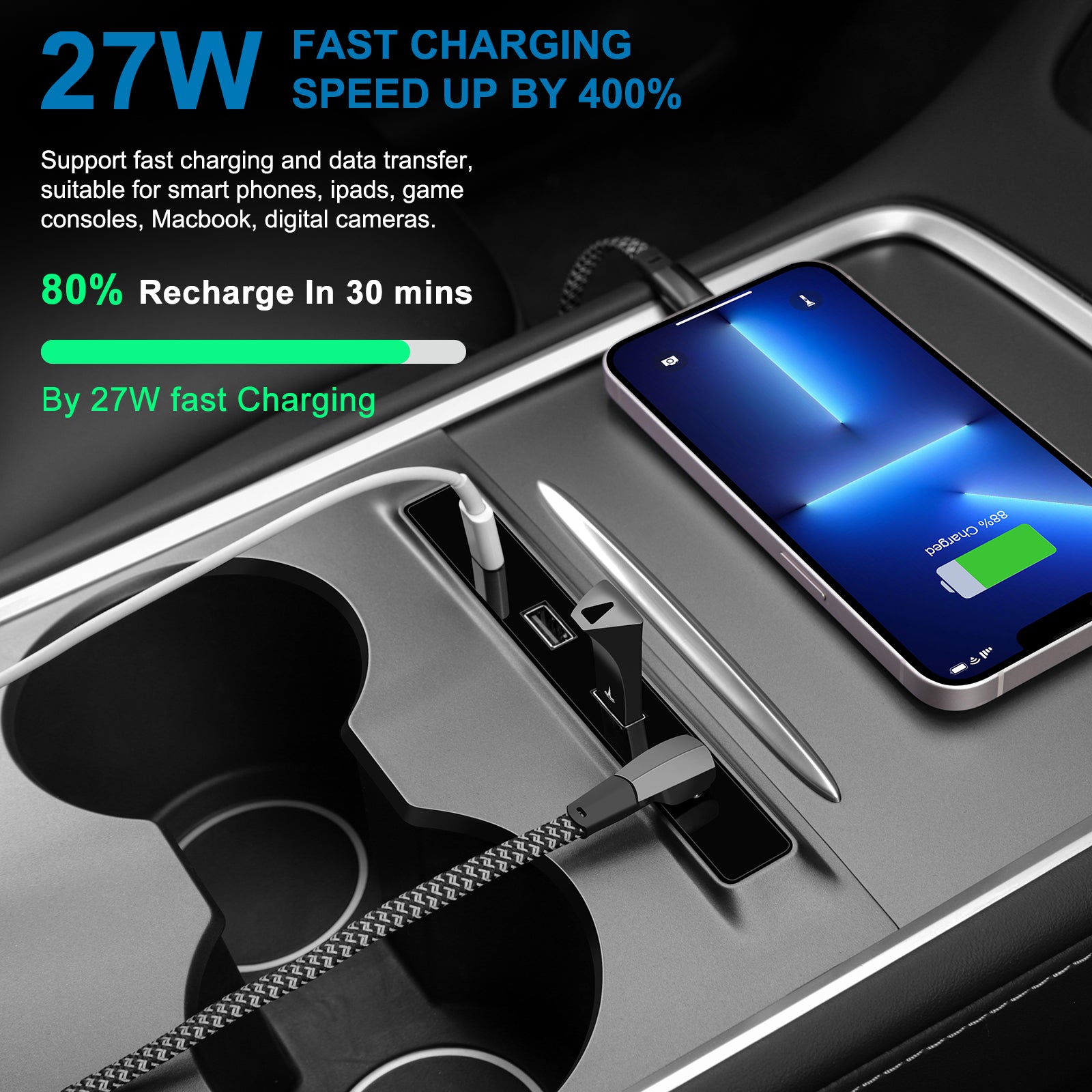 - This Tesla center console HUB has 2 USB-A ports (7.6W charging) and 2 Type-C ports that support 27W fast charging. With dual USB-A data transmission, it supports multiple devices charging, data transmission, multiplayer gaming, entertainment and music at the same time.