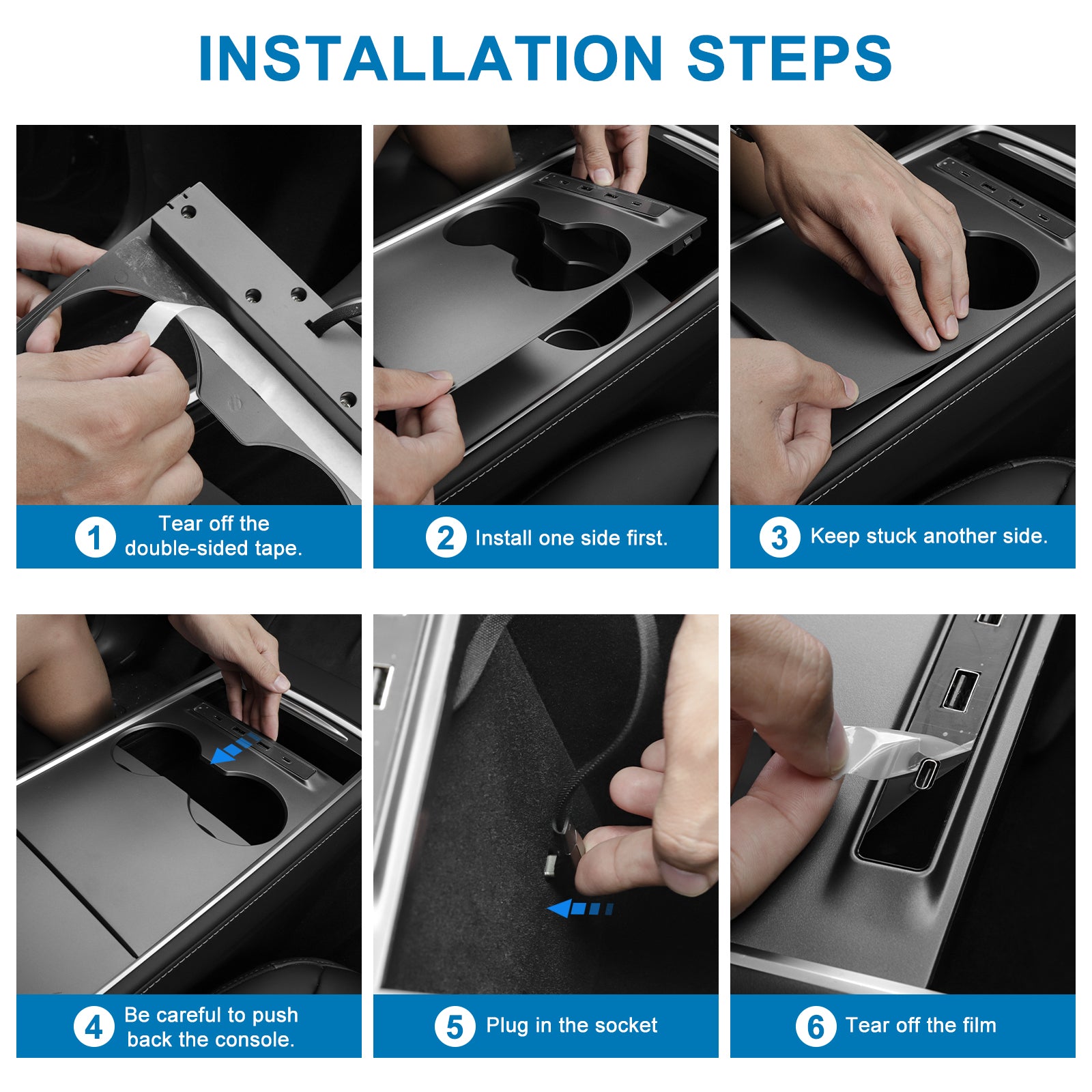 - This USB port station supports non-destructive installation. The stylish design does not affect the layout and center console switches of the original car. Just insert it into the center console and peel off the 3M tape on the back, then it will fit the center console perfectly.