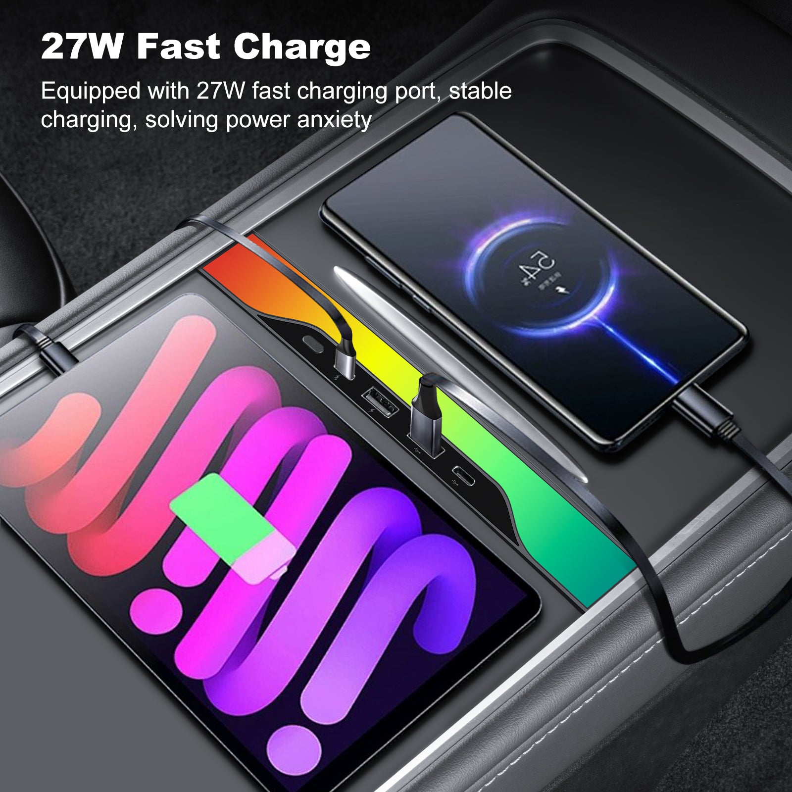 - Multi-Port Expansion: This Tesla center console HUB has 2 USB-A ports (7.6W charging) and 2 Type-C ports that support 27W fast charging. With dual USB-A data transmission, it supports multiple devices charging, data transmission, multiplayer gaming, entertainment and music at the same time.