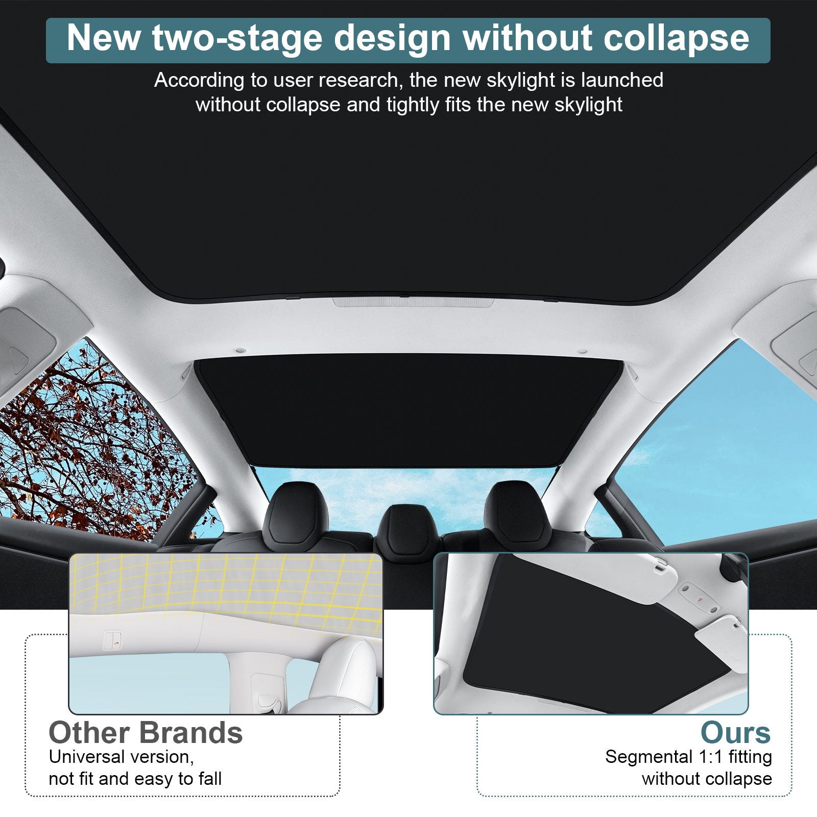 [Easy to Use and Store] Foldable roof sunshade for 2024-2025 tesla model 3, Easy to Store. New two-section, non-collapsing design. Easy to install, one second to do. Installed on the top of the glass car using special clips, firm and stable.