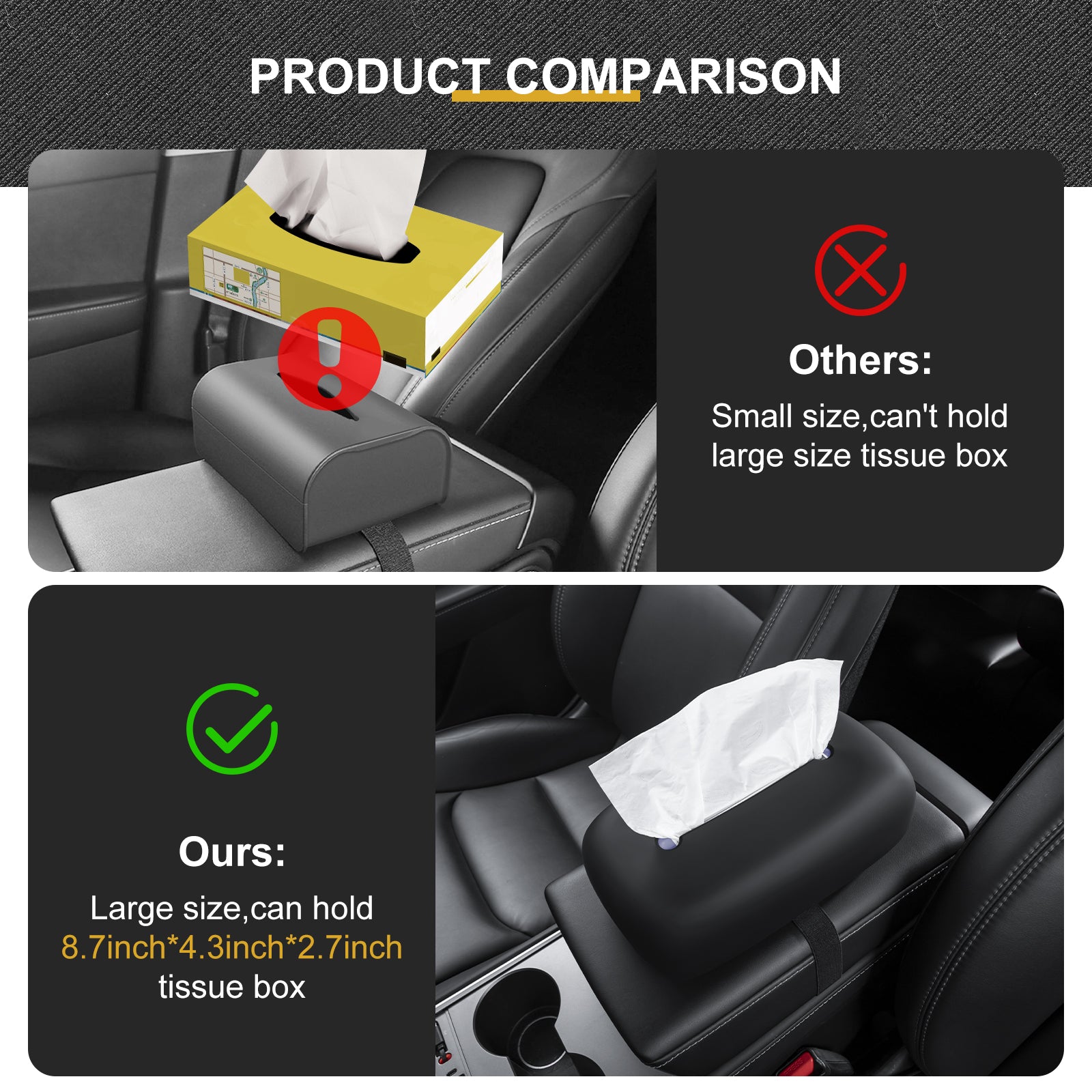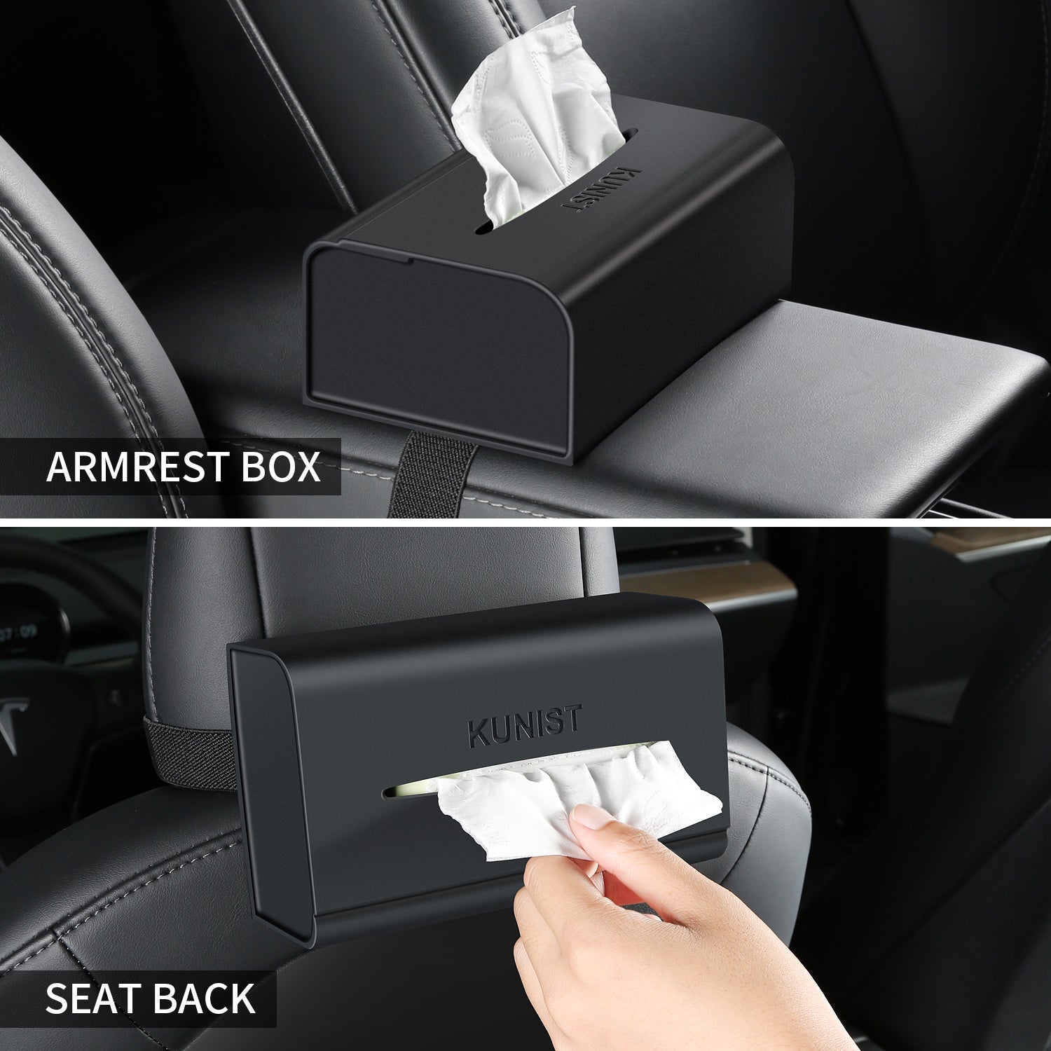- The functional tissues box can be placed on the armrest box, the central control screen up and down, on the dashboard, behind the seat headrest, and sun visor. without the elastic band, you can put it in your home or office. Never worry about it will hurt your kids.