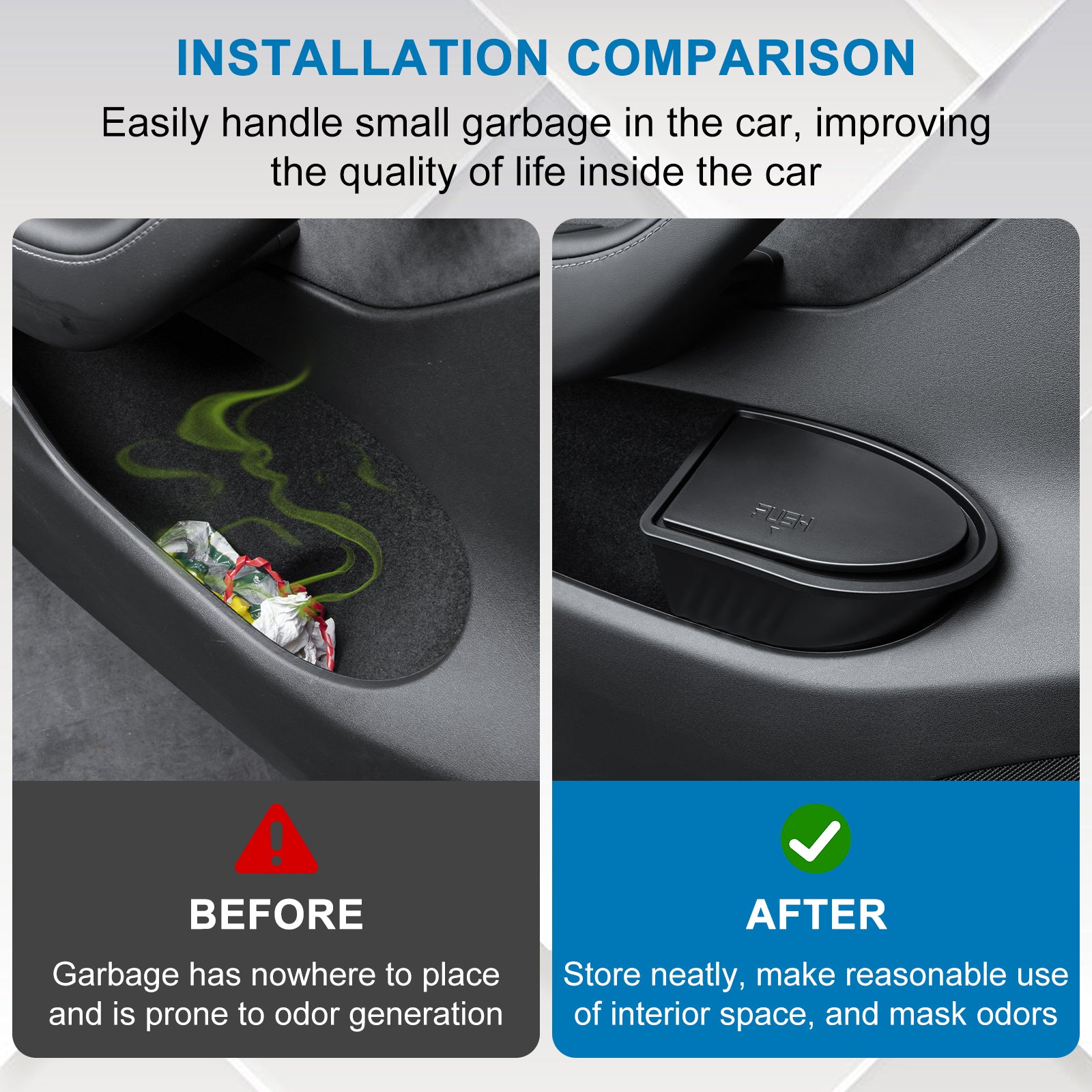 Convenience: the Tesla trash can is attached to the front door compartment and takes up minimal space. The trash can is also accessible from the driver's/co-driver's seat, making it easy for you to throw trash into the trash can. It will not create an obstacle for the driver/passenger to get out of the car.
