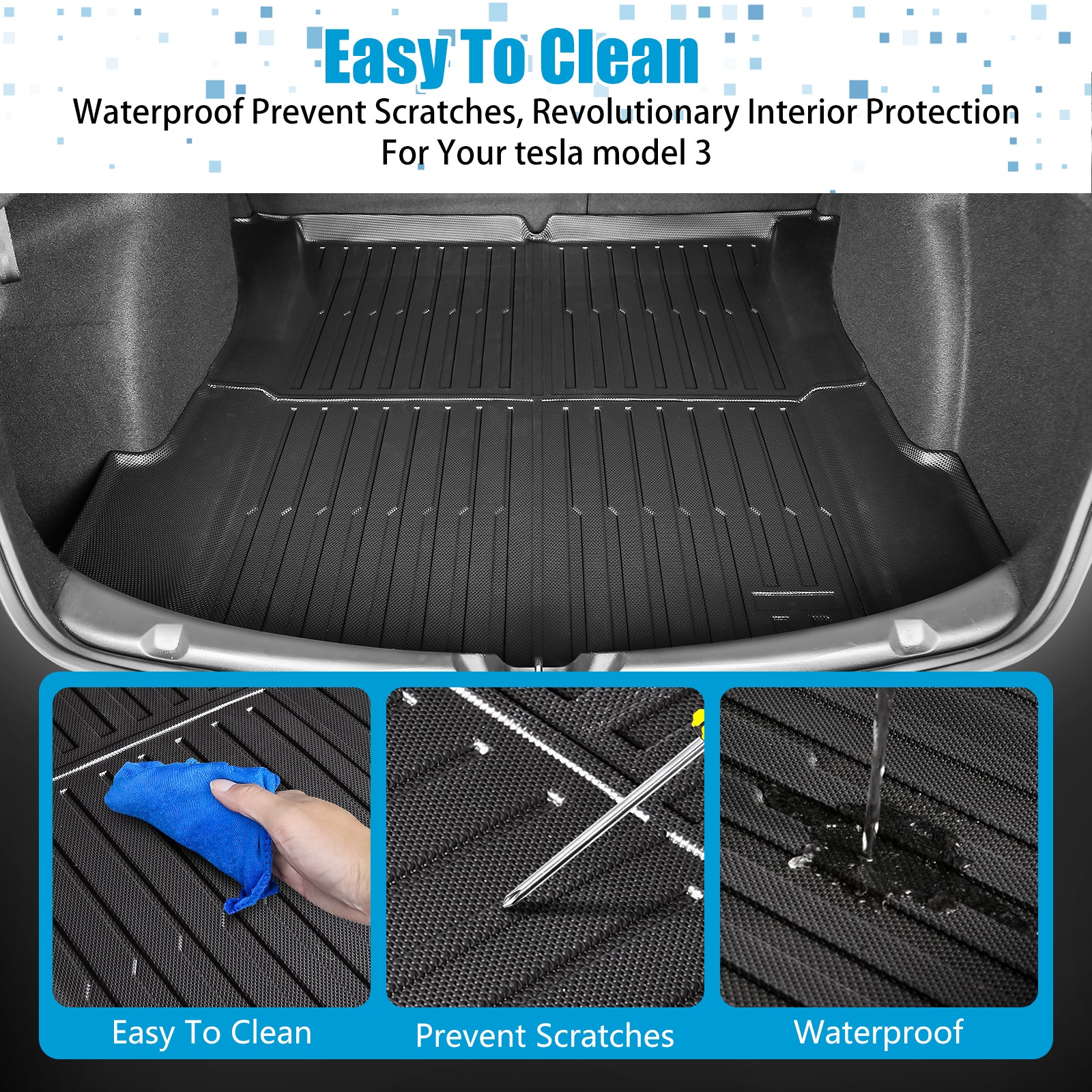 - Tesla trunk mats are waterproof, stain resistant, durable, and easy to clean. Easily clean by simply wiping down or remove them from your car to hose them down with water. Keeps your carpet looking brand new!