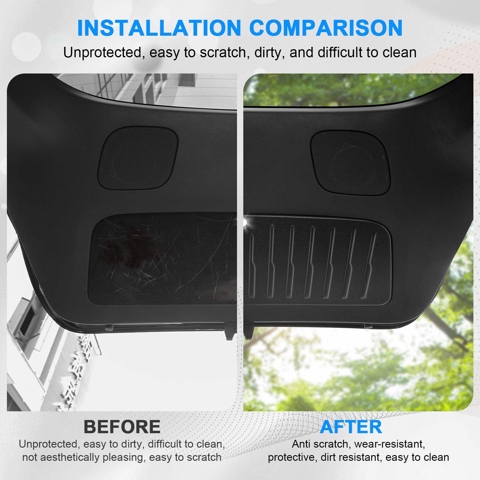 Great Protection-If your tesla tailgate area is easy to dirty and scratch, hard to wash. You must install this trunk door liner to protect your tesla model y trunk door spot. It doesn't slip or move around due to equipped velcro on the back. Does not hurt the original car material after removal.