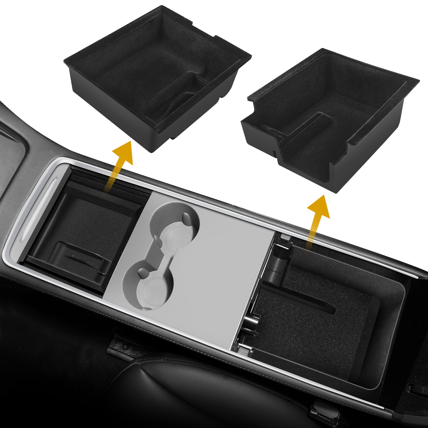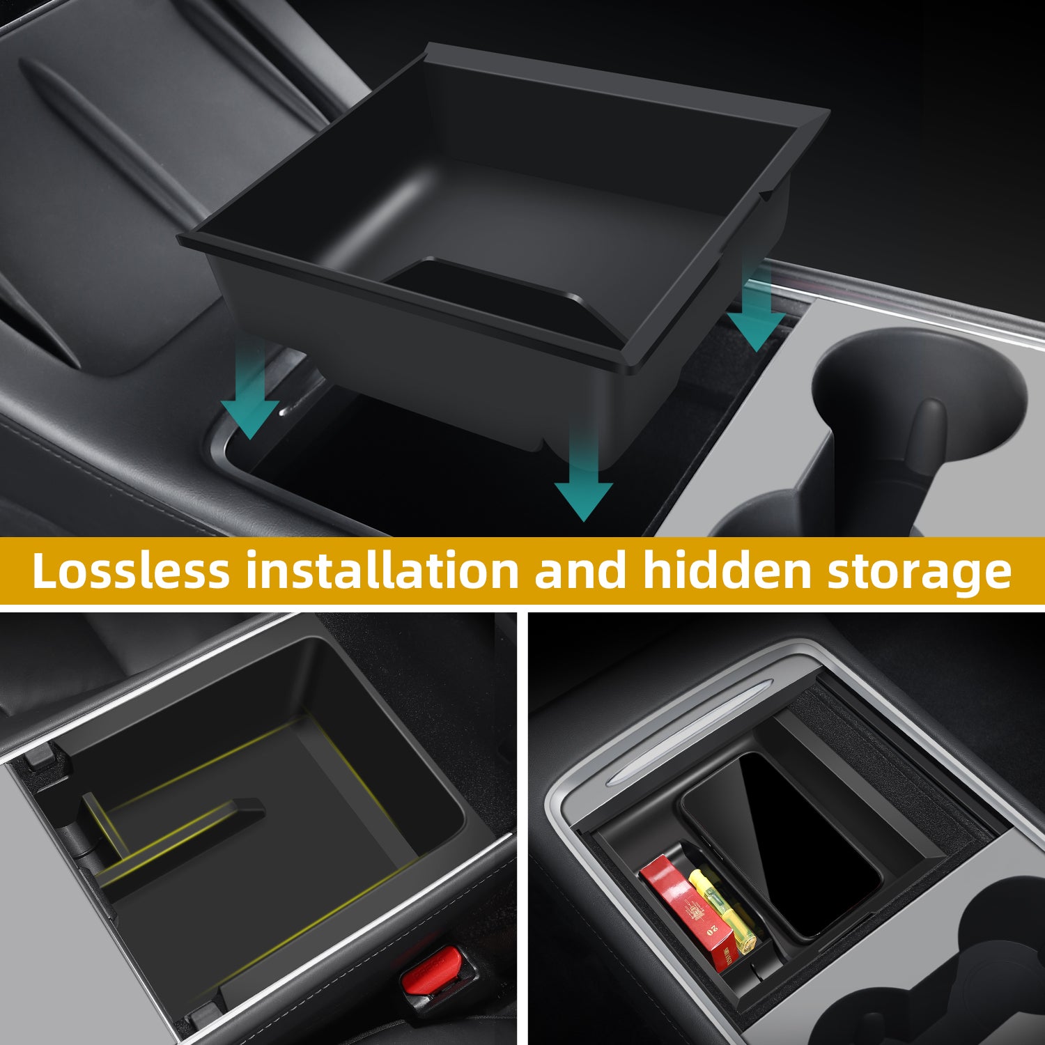 - The Center Console Storage Drawer can easily slide smoothly back and forth. Pulling to Hide guard privacy, which easily accesses the upper and lower compartment simply by drawing. Provide you with extra doubles. Make your Tesla center console organizer no longer messy.